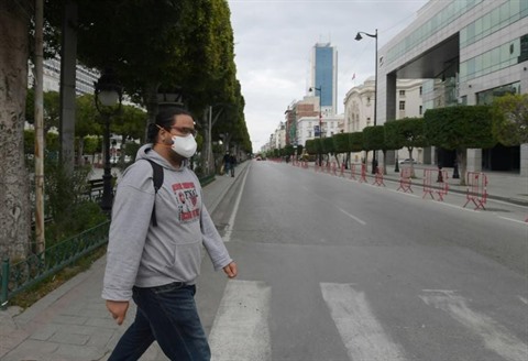 | Un homme portant un masque de protection contre le nouveau coronavirus marche dans le centre de Tunis, le 18 mars. |