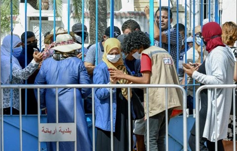 | Des Tunisiens se présentent à l'entrée d'un centre de vaccinations de Tunis, le 8 août. |