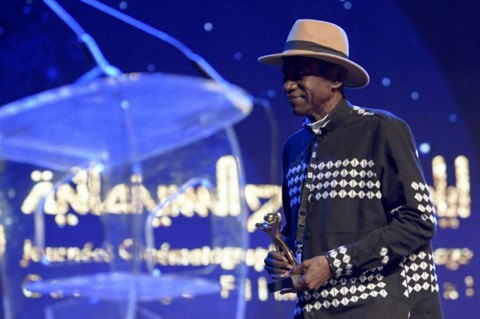 | Le réalisateur sénégalais Baba Diop, lauréat du Tanit d'Or pour l'ensemble de sa carrière, lors de la cérémonie d'ouverture de la 32e édition du Festival international du cinéma de Carthage, le 30 octobre. |