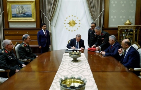 | Le président turc Recep Tayyip Erdogan (centre) rencontre le Conseil suprême militaire et le Premier ministre Binali Yildirim (2e, droite), le 28 juillet à Ankara. |