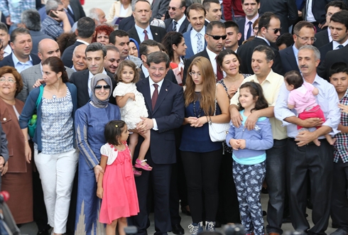 | Le Premier ministre Ahmet Davutoglu (centre) et les ex-otages, le 20 septembre |