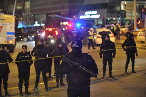 | Des policiers devant le centre d'exposition où l'ambassadeur russe a été abattu, le 19 décembre. |