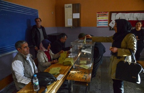 | Une Turque dépose son bulletin de vote dans l'urne lors du référendum sur le renforcement des pouvoirs du président Erdogan, le 16 avril 2017 à Diyarbakir. |