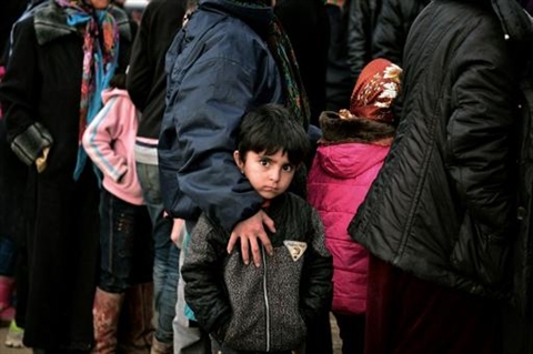 | Un enfant dans un camp de migrants à la frontière gréco-macédonienne, près du village d'Idomeini en Grèce, le 4 mars |