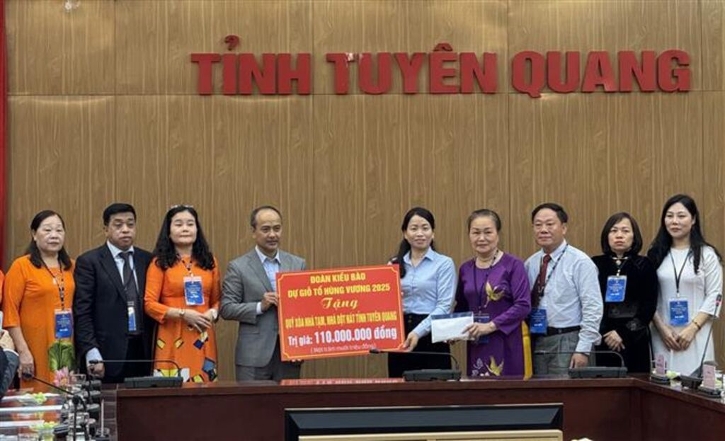| La délégation des Vietnamiens d'outre-mer présente des dons, contribuant au programme d'élimination de l'habitat précaire dans la province de Tuyên Quang. |