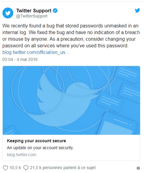 "Cela permet à nos systèmes de valider votre compte sans révéler votre mot de passe, ce qui est une norme de l'industrie", poursuit le blog. "En raison d'un bug, les mots de passe ont été inscrits dans un registre interne avant d'être soumis au processus de hachage. Nous avons nous-mêmes trouvé l'erreur, supprimé les mots de passe et mettons des mesures en place pour que ce bug ne se reproduise pas", ajoute Twitter.