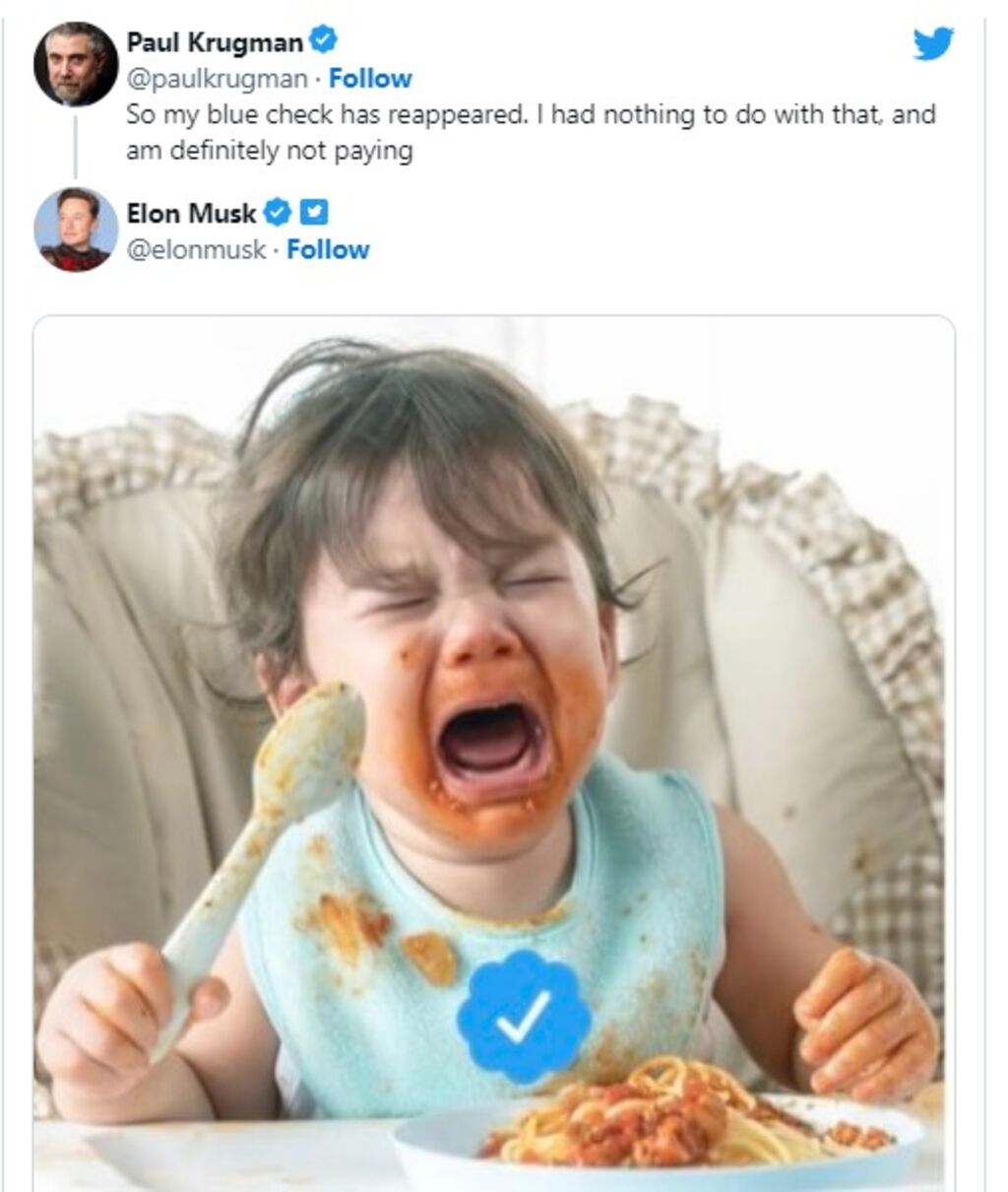 | Le patron de Twitter Elon Musk a répondu à l'économiste progessiste et prix Nobel Paul Krugman, avec l'image d'un bébé barbouillé de sauce tomate, pleurant devant son assiette de pâtes et portant un bavoir estampillé de la coche bleue. |