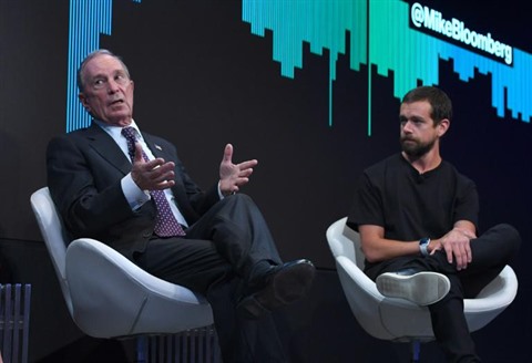| Le patron de Twitter Jack Dorsey (droite) et le fondateur de l'agence Bloomberg, Michael Bloomberg, le 1er mai 2017 à New York. |