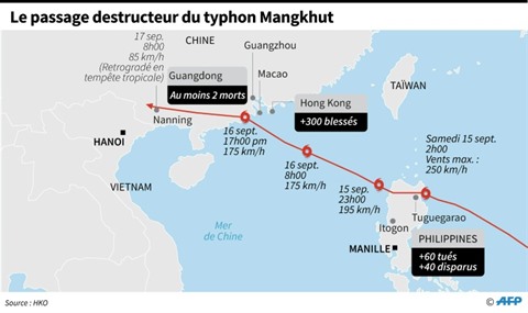 La tempête, la plus puissante depuis le début de l'année dans le monde, a détruit samedi 15 septembre des logements et inondé les régions agricoles du nord des Philippines avant de poursuivre son chemin vers Hong Kong (Chine) et le Sud de la Chine, où il a fait quatre morts. La police nationale de l'archipel d'Asie du Sud-Est, qui essuie régulièrement de violents typhons, a annoncé un nouveau bilan de 74 morts mais celui-ci devrait encore s'aggraver.
