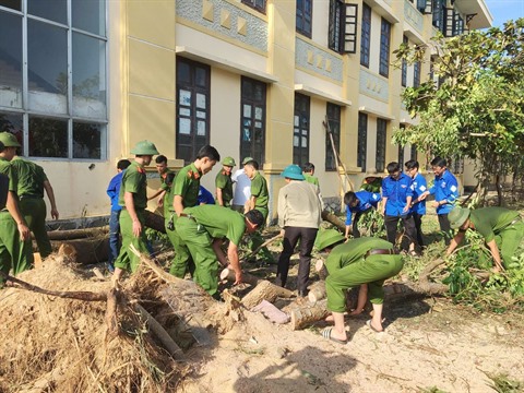 | Le nettoyage de l'environnement au lycée Vo Nguyên Giap, province de Quang Binh (Centre) après le passage du typhon Doksuri. |