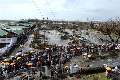 | Des habitants de Tacloban (Philippines) attendent de l'aide. |