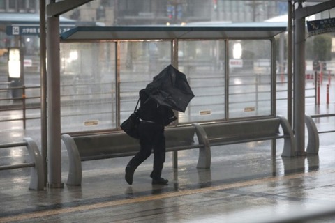 | Un homme s'abrite des fortes précipitations causées par le typhon Trami à Kagoshima (Sud-Ouest du Japon) le 30 septembre. |