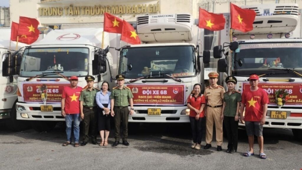 | Camions transportant des marchandises de secours des provinces du Sud en faveur des localités du Nord touchées par le typhon Yagi. |