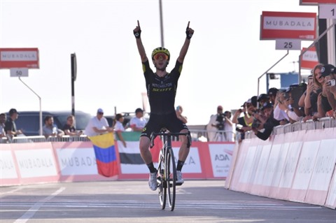 | Le Britannique Adam Yates célèbre sa victoire lors de la 3e étape du Tour des Émirats à Jebel Hafeet, le 25 février. |