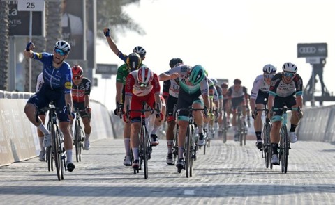 | L'Irlandais Sam Bennett (1er plan, à gauche) vainqueur au sprint de la 6e étape de l'UAE Tour, le 26 février, près de Dubai. |