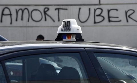 | Une affiche anti-Uber sur un taxi qui bloque la porte Maillot, à Paris, le 26 juin lors d'un mouvement de grève contre le géant des véhicules de transport avec chauffeurs, Uber |