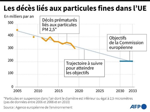 Au début des années 1990, les particules fines, qui pénètrent profondément dans les poumons, provoquaient ainsi près d’un million de décès prématurés dans les 27 pays de l’UE, d’après ces données. Un chiffre déjà tombé à environ 450.000 en 2005.