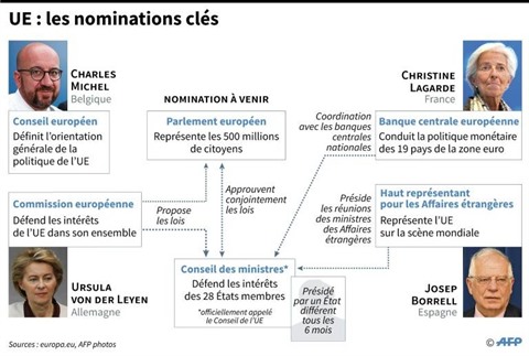 L'actuel Premier ministre libéral belge Charles Michel hérite lui de la présidence du Conseil européen, l'instance regroupant les dirigeants des 28, tandis que le nom du socialiste espagnol Josep Borrell est proposé pour prendre la tête de la diplomatie européenne.
