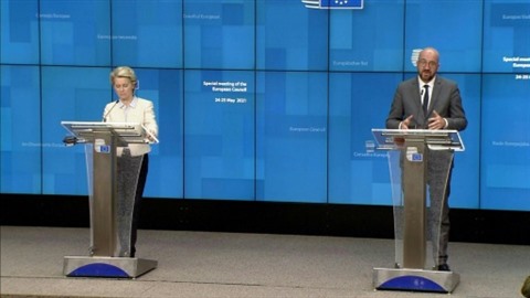 | La présidente de la Commission européenne Ursula von der Leyen et le président du Conseil européen Charles Michel, à Bruxelles, le 24 mai. |