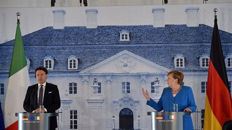 | La chancelière allemande Angela Merkel et le président du Conseil italien, Giuseppe Conte assistent à une conférence de presse à l'extérieur de Berlin le 13 juillet. |