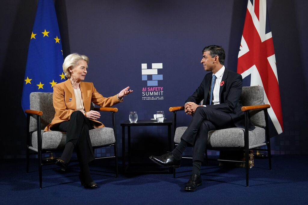 | La présidente de la Commission européenne, Ursula von der Leyen et le Premier ministre anglais, Rishi Sunak, en novembre 2023. |