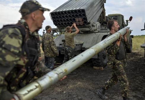 | Des soldats ukrainiens chargent un lance lance-roquette multiple Grad, dans la région de Lougansk, le 18 août |