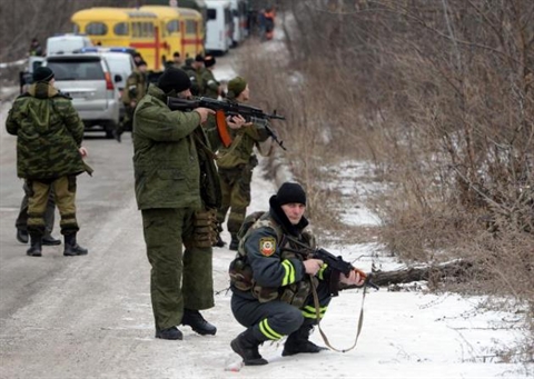 | Des rebelles pro-russes prennent position sur une route proche de la ville stratégique de Debaltseve, le 19 février 2015. |