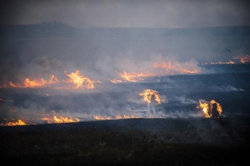 | Des flammes dans un champ autour des débris d'un avion de combat ukrainien accidenté près du village de Zhanivka à 40 kilomètres au nord-est de Donetsk, le 7 août. |