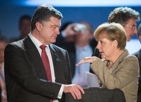 | Le président ukrainien Petro Porochenko (gauche) en conversation avec la chancelière allemande Angela Merkel, au sommet de l'OTAN de Newport au Pays de Galles, le 4 septembre. |