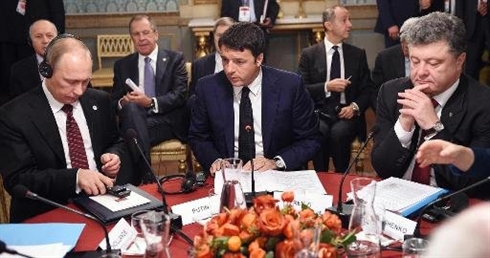 | De gauche à droite . Vladimir Poutine, Matteo Renzi et Petro Porochenko lors des discussions à Milan le 17 octobre. |
