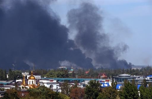 | Des colonnes de fumée s'élèvent près de l'aéroport de Donetsk soumis aux tirs d'artillerie de l'armée ukrainienne et des rebelles, le 14 septembre. |