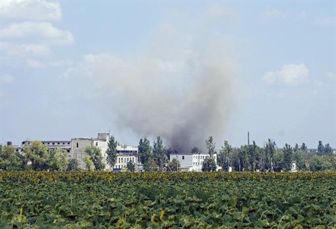 | Des colonnes de fumée s'échappent de bâtiments à Mariïnka (environs de Donetsk) après d'intenses bombardements, le 5 août |