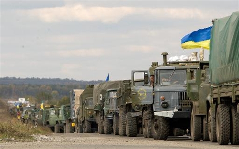 | Une colonne de camions ukrainiens est arrêtée dans le village de Semenovka, près de Slaviansk, dans l'Est de l'Ukraine, le 5 octobre. |