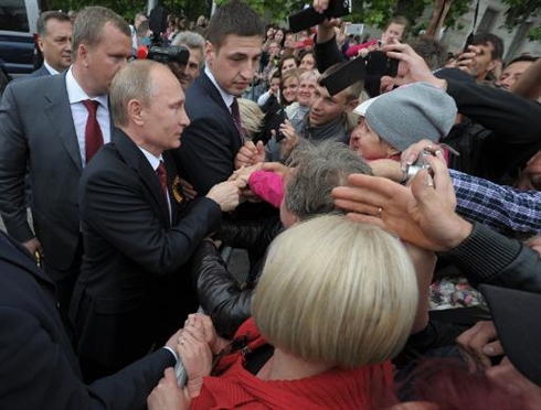 | Le président russe Vladimir Poutine (centre), le 9 mai à Séb |
