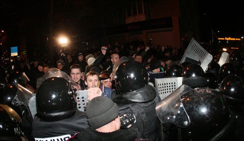 | Des activistés pro-russes essaient de pénétrer dans les locaux des services de sécurité à Donetsk pour libérer leur chef de file, le 6 mars. |