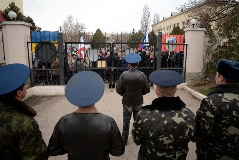 | Des manifestants devant le portail de la base aérienne de Belbek en Crimée. |