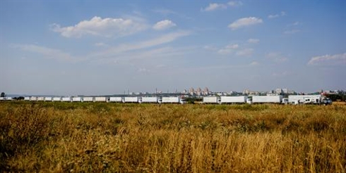 | Le convoi chargé de plus de 1.800 tonnes d'aliments, de médicaments et de générateurs, stationné sur un aérodrome militaire de Voronej, à 300 km de la frontière ukrainienne, le 13 août |