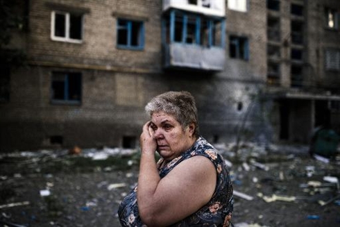 | Sous le choc, une femme dans une rue de Yasynuvata près de Donetsk en Ukraine après un pillonage de son quartier, le 12 août |