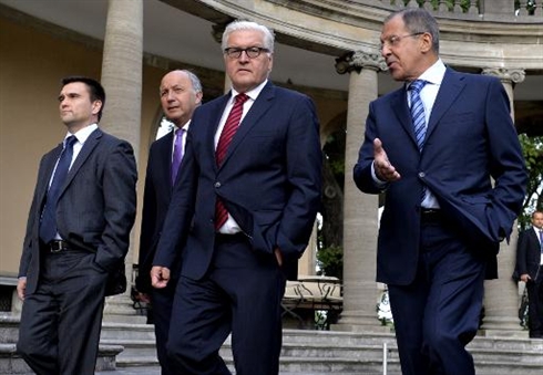 | Les ministres ukrainien Pavlo Klimkin, français Laurent Fabius, allemand Frank-Walter Steinmeier et russe Sergueï Lavrov (de gauche à droite), le 17 août à B |