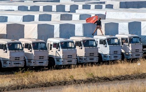 | Un chauffeur installe un drapeau rouge sur son camion qui fait partie du convoi humanitaire, immobilisé à Kamensk-Shakhtinsky, le 20 août |