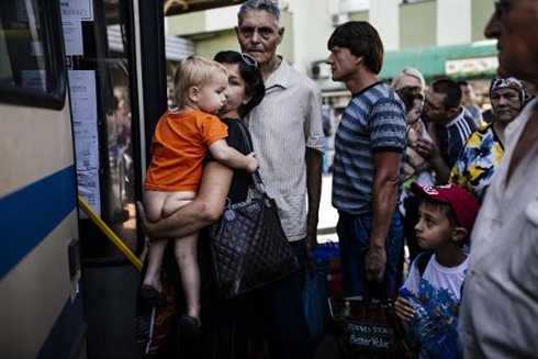 | Une mère et son enfant montent dans un autobus à Donetsk où les combats s'intensifient, le 20 août |
