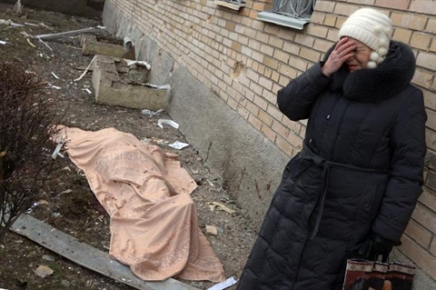 | Une femme pleure près du corps de son fils tué lors du bombardement de l'hôpital de Donetsk, le 4 février. |