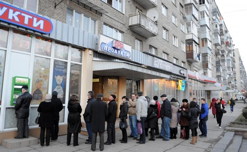| Dans une ville à l'Ouest de l'Ukraine, les habitants retirent le maximum d'argent possible aux distributeurs bancaires. |