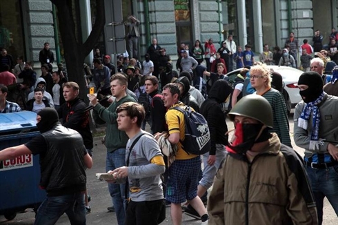 | Des pro-ukrainiens et des pro-russes s'affrontent à Odessa en marge d'un match de football opposant le Chornomorets Odessa au Metalist Kharkiv, le 2 mai 2014. |