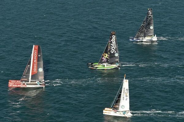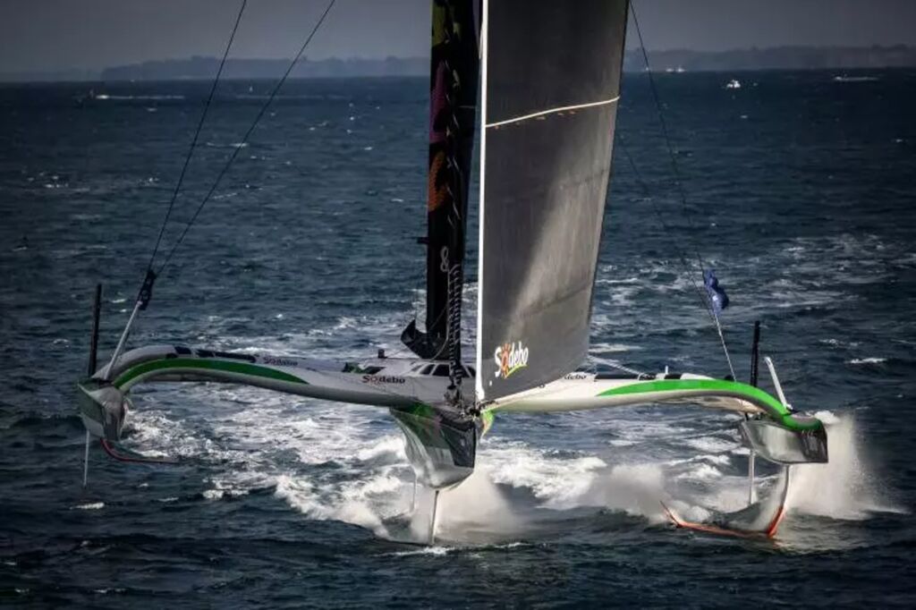 | Le multicoque Sodebo du navigateur français Thomas Coville au départ de l'Ultim Challenge le 7 janvier à Brest. |