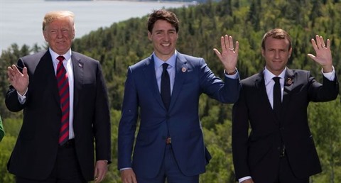| Le président américain Donald Trump (gauche), le Premier ministre canadien Justin Trudeau (centre) et le président français Emmanuel Macron, lors du Sommet du G7 à La Malbaie, le 8 juin 2018 au Canada. |
