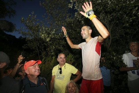 Le traileur corse Lambert Santelli à l'arrivée de sa traversée du GR20 en 30 heures et 25 minutes, à Conca, le 26 juin. Photo : AFP/VNA/CVN |