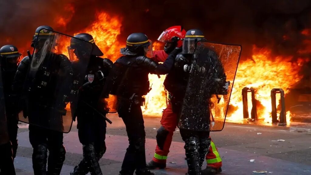 | Des CRS près en position près d'une station de vélos en libre-service incendiée lors d'une manifestation contre la réforme des retraites, le 1er mai à Paris. |