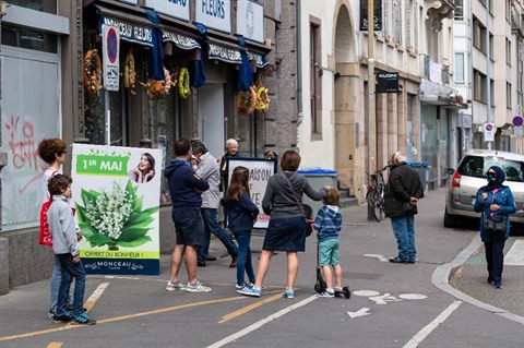 | Des clients attendent devant un magasin de fleurs pour acheter du muguet, le 1er mai 2020 à Strasbourg. |