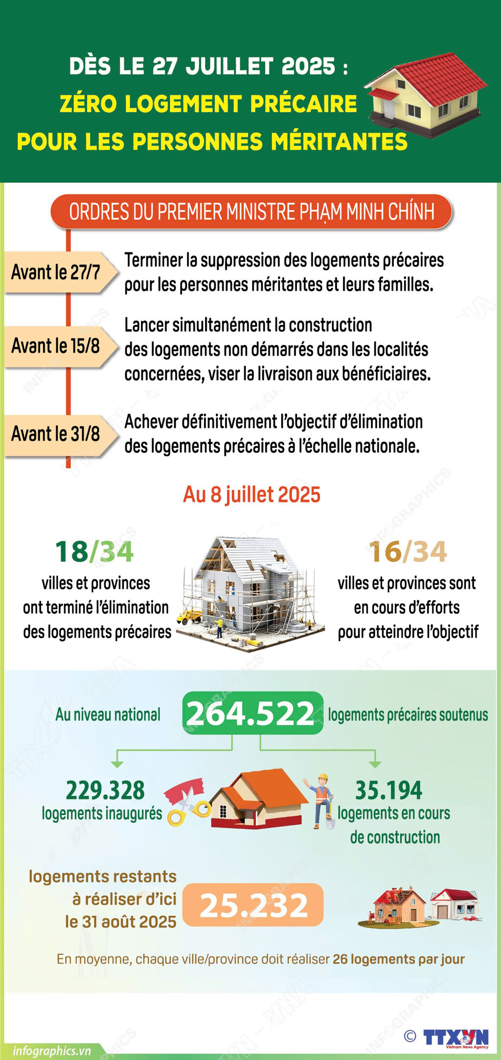 À l'occasion de la Journée des invalides de guerre et des héros mort pour la Patrie, le 27 juillet, le pays tout entier a concrétisé un geste de gratitude à la fois humain et profondément significatif envers les familles ayant rendu des services à la révolution et les proches des martyrs : soutenir la construction ou la rénovation de logements pour tous les foyers ayant exprimé un besoin. Ce résultat témoigne de l’attention constante et de la direction déterminée du gouvernement et du Premier ministre, ainsi que des efforts conjoints des collectivités locales, incarnant l’esprit vietnamien du "Boire de l'eau en se souvenant de la source".